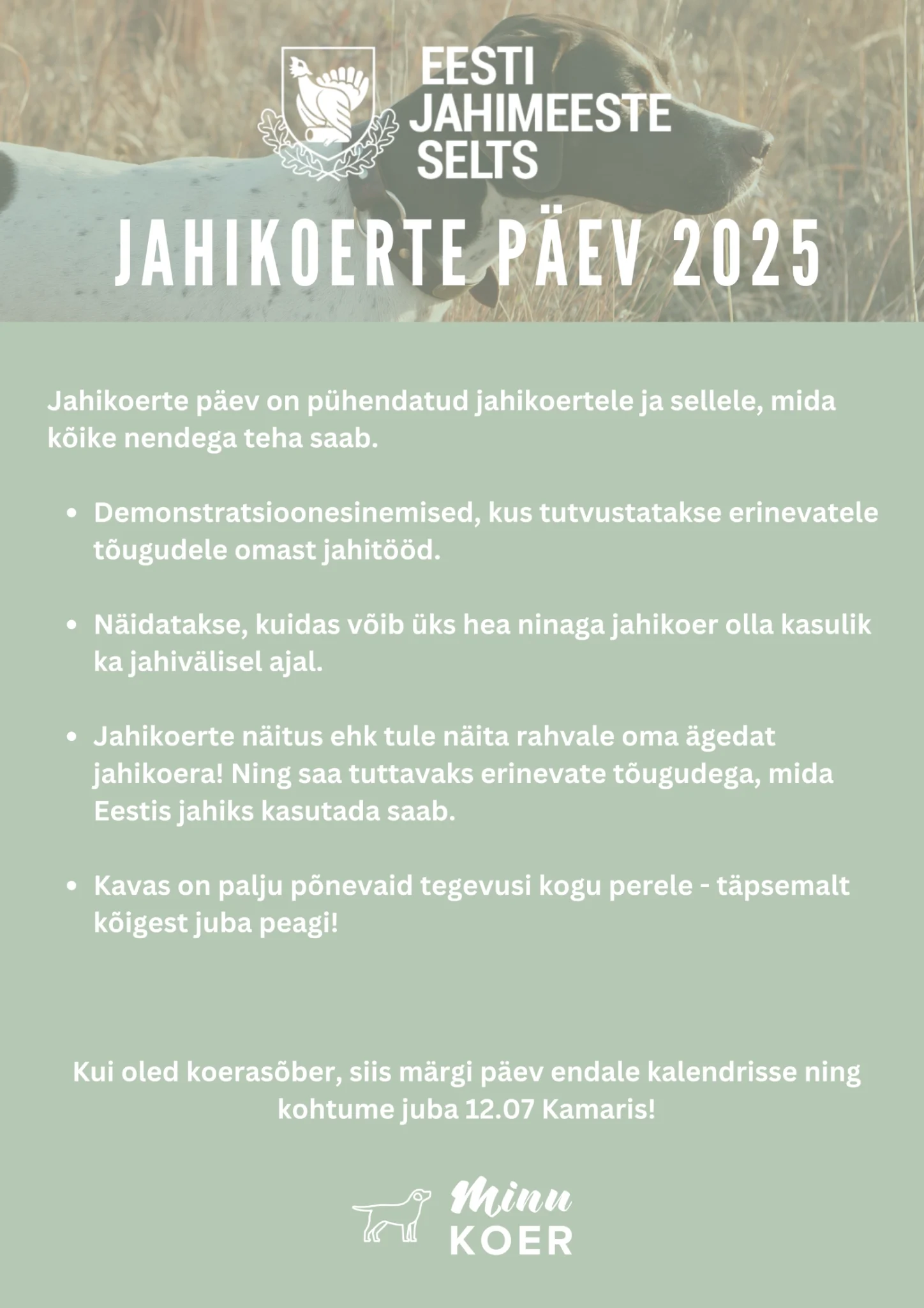Tule näita rahvale oma ägedat jahikoera! Ning saa tuttavaks erinevate tõugudega, mida Eestis jahiks kasutada saab. Ning kes teab – ehk leiad endalegi uue lemmiku? Kohtunikuks on mitmekümneaastase staažiga aktiivne jahimees ja pikaaegne kasvataja Euroopast. Kuna tegemist on avatud näitusega, kus ametlikke serte ei jagata, siis on oodatud osalema ka nii kupeeritud kui ka teised jahitõugu koerad, kellel ametlikele näitustele muidu asja ei ole. Hea võimalus saada hinnang oma koerale ala tõeliselt asjatundjalt!