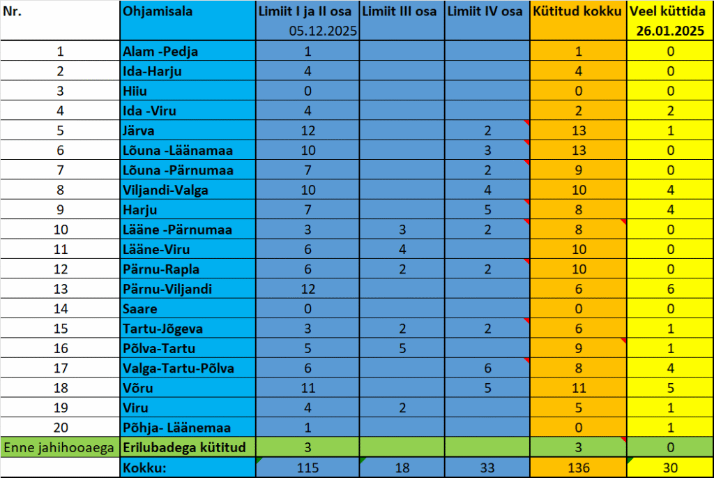20 ohjamisalast väljastati lube 18 ohjamisalale, neist 7 ohjamisalal on limiit täidetud. Pärnu-Viljandi ohjamisalal on veel küttida 6 isendit, Võru ohjamisalal 5 isendit. Lisaks on Viljandi-Valga, Harju ja Valga-Tartu Põlva ohjamisalal realiseerimata 4 hundijahiluba. Ida-Harju ohjamislal on veel 2 ja Järva, Tartu-Jõgeva, Põlva-Tartu, Viru ja Põhja-Läänemaa ohjamislal üks luba alles.