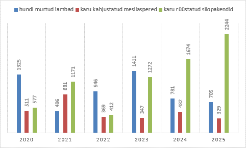 Keskkonnaamet toetab olulise hüvitisega loomakahjude ennetamiseks efektiivsete ennetusmeetmete rakendamist ning võttis kokku 2025. aastal suurkiskjate, hüljeste ja kotkaste tekitatud kahjud. Vaatamata Eesti suurkiskjate asurkondade väga heale seisundile ja meedias suure tähelepanu pälvimisele olid hundi ja pruunkaru tekitatud kahjud möödunud aastal võrreldes paari varasemaga valdavalt langustrendis.