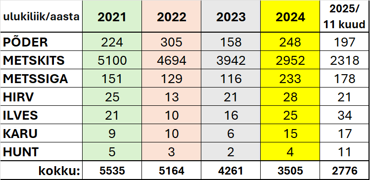Teie ees avanevad kaardikihid, millisetele on kantud aastatel 2021-2024 suurulukitega registreeritud metsloomaõnnetused Eestis. Võimalusel ka jooksva aasta juhtumid.