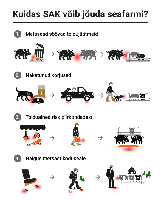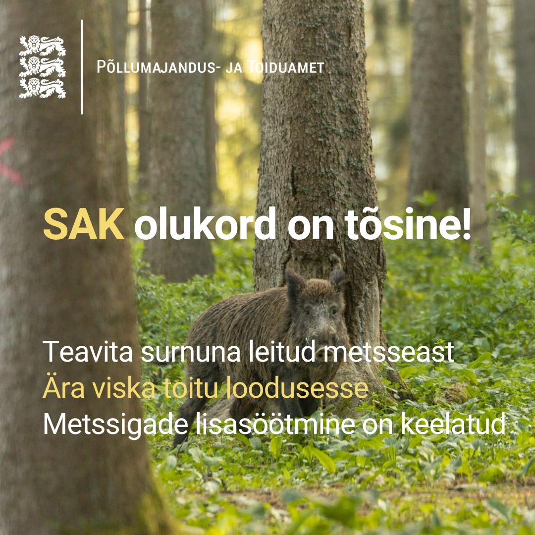 - Oma loomade kaitsmiseks nakatumise eest tuleb pärast kokkupuudet metssea korjusega järgida elementaarseid bioohutusmeetmeid. Enne loomapidamishoonesse sisenemist vaheta riided, desinfitseeri või vaheta jalanõud.