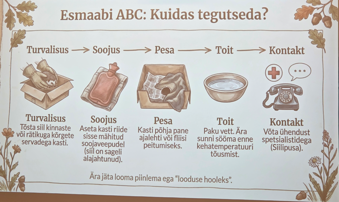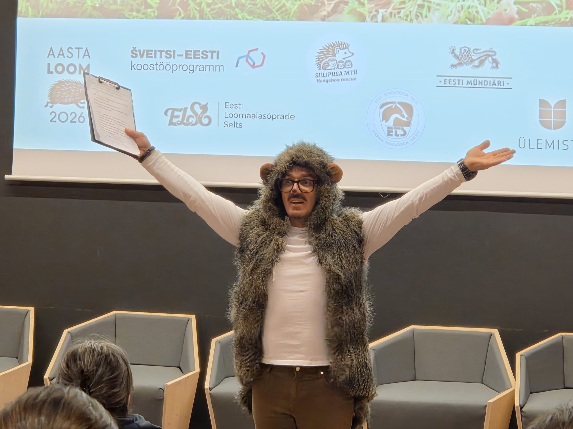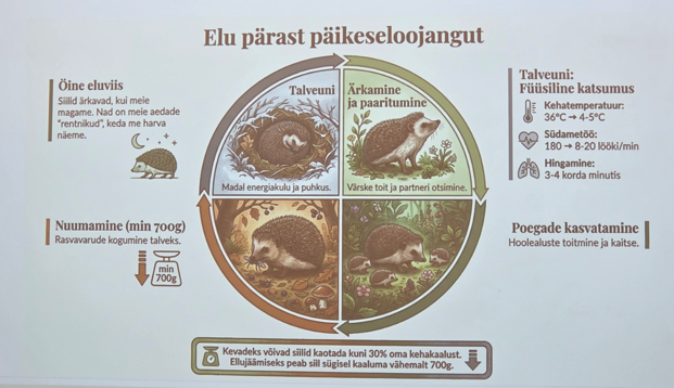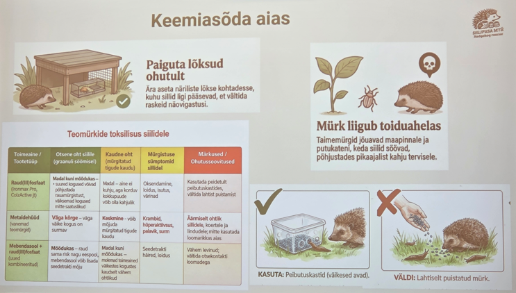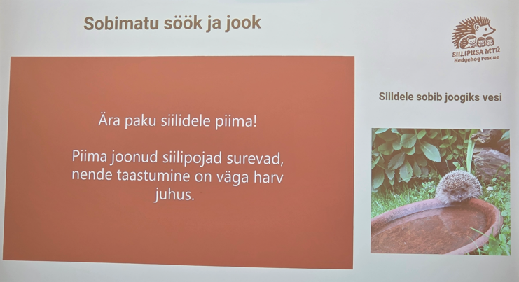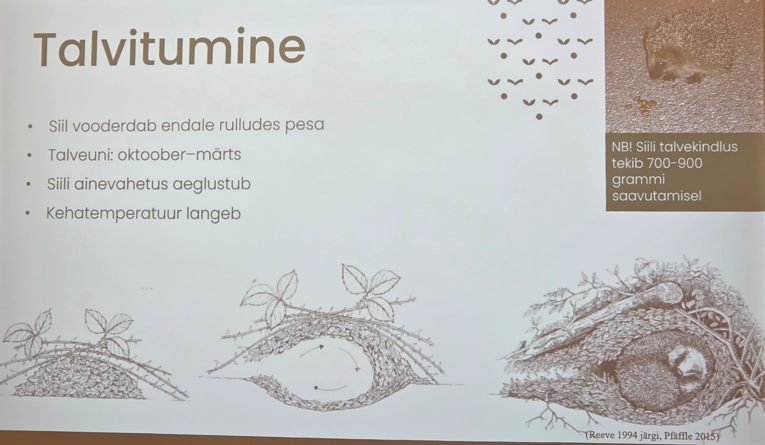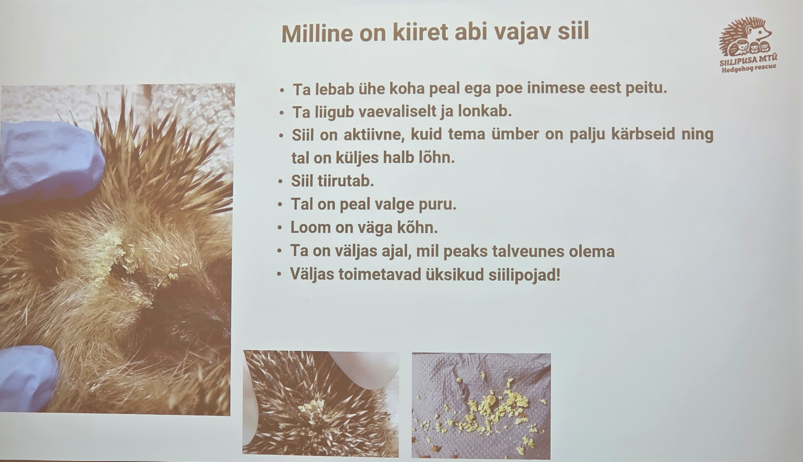 Anneli Sinirand MTÜ Siilipusast tegi ettekande sellest, milline on siilidele turvaline elukeskkond. Ta andis ülevaate, milline on siilide elu pärast päikeseloojangut, millised ohutegurid mõjutavad siilide elu ning millised ohud varitsevad siile inimese läheduses elades.