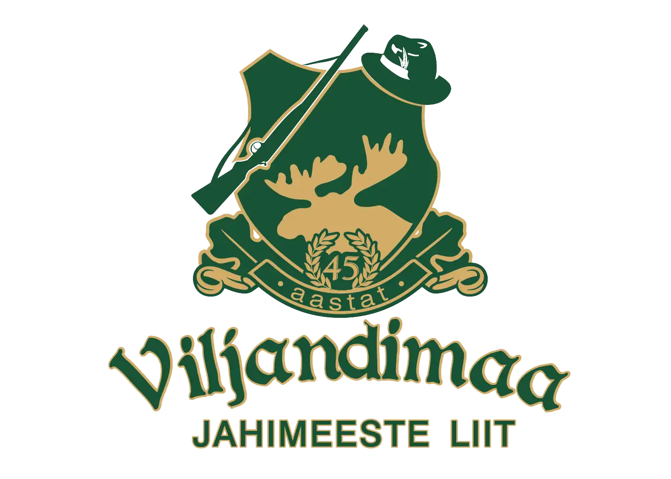 VJL logo on tumerohelisel taustal põdra siluett, kaabu, jahipüssi ja kirjaga Viljandimaa Jahimeeste liit.